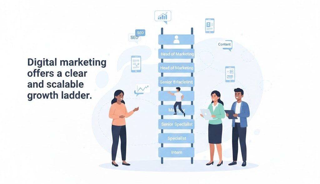 Intern → Executive → Specialist → Senior Specialist → Manager → Growth Lead → Head of Marketing → Consultant / Agency Founder